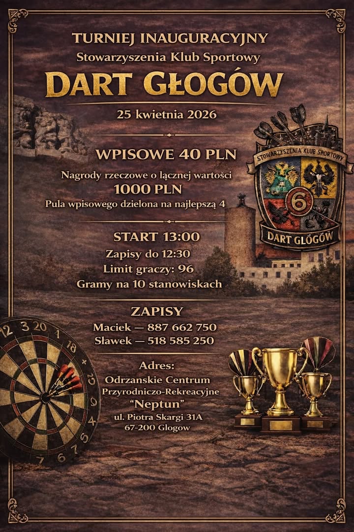 25kwietnia13:0021:00Turniej inauguracyjny Dart GłogówOdmianaSteelWojewództwoDolnośląskieMiastoGłogów