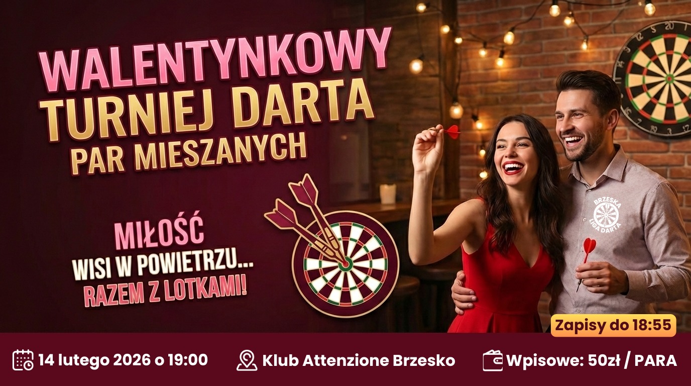 14lutego19:0023:00Walentynkowy turniej dartaOdmianaSteelWojewództwoMałopolskieMiastoBrzesko