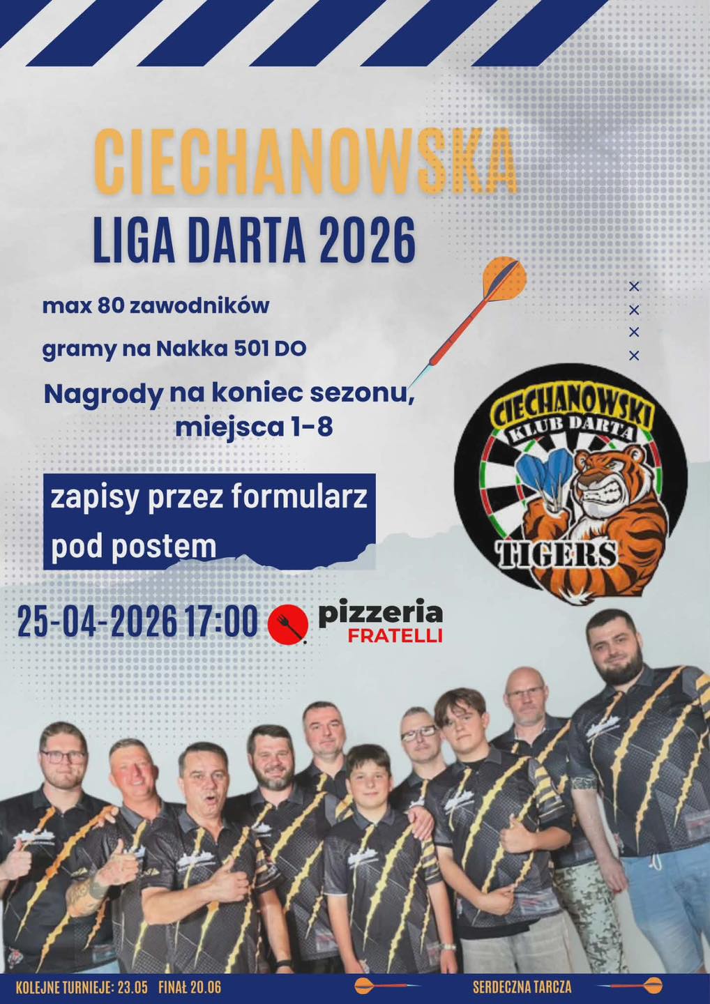 Wpisowe: 25 zł.Zapisy przez FB Ciechanowskiej Ligi Darta.Równolegle rozgrywana jest liga młodzieżowa.