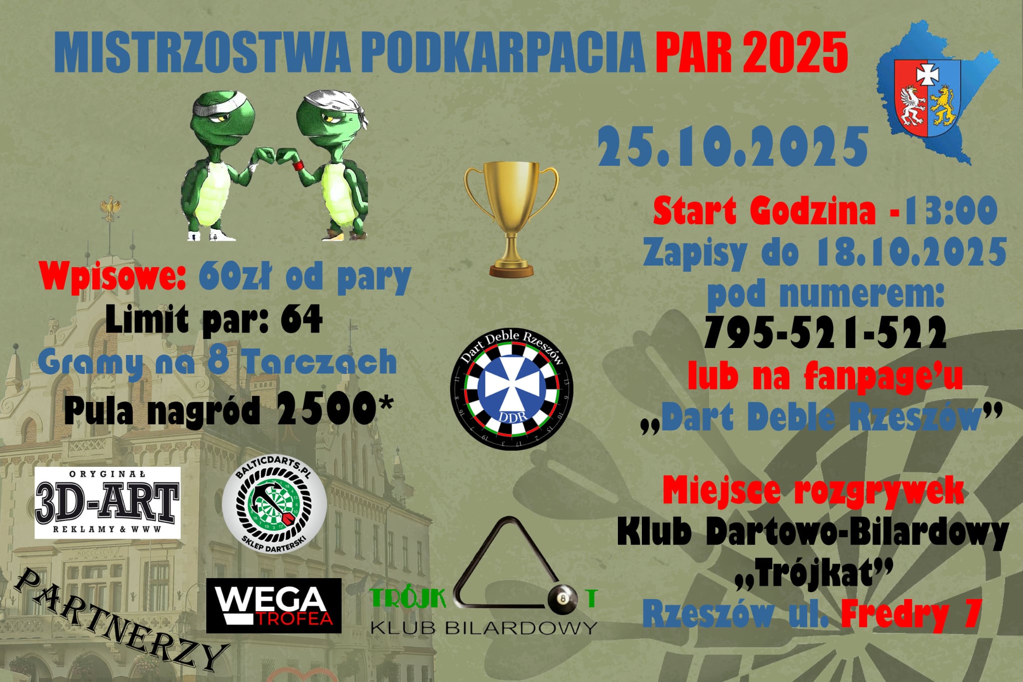 Wpisowe 60 zł. Zapisy przez FB Dart Deble Rzeszów.