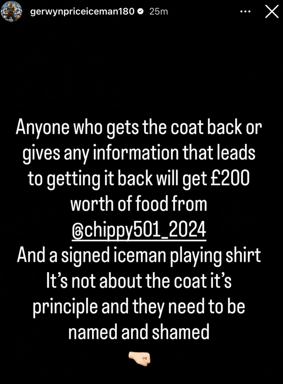 Walijczyk nie rezygnował więc z szukania dalszych tropów. Z racji na fakt, że nieopodal Newport – w Markham – posiada własną restaurację, zaproponował znalazcy lub informatorowi pewną nagrodę. – Każdy, kto odzyska kurtkę lub przekaże jakiekolwiek informacje, które doprowadzą do jej odzyskania, otrzyma jedzenie o wartości 200 funtów od Chippy501 [nazwa restauracji – red.]. Co więcej, dorzucę podpisaną koszulkę Icemana. Tu nie chodzi o tę kurtę, ale o zasady – złodzieja trzeba ujawnić i napiętnować.