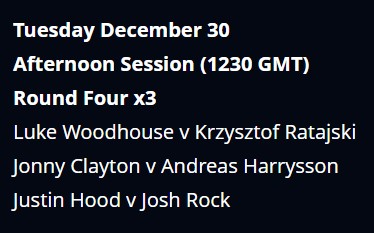Według informacji podanych na stronie PDC, spotkanie Ratajski – Woodhouse będzie pierwszym, które zostanie rozegrane w ramach sesji popołudniowej. Co za tym idzie – powinno wystartować ok. 13:45 (czyli ok. 12:45 czasu obowiązującego w Wielkiej Brytanii).