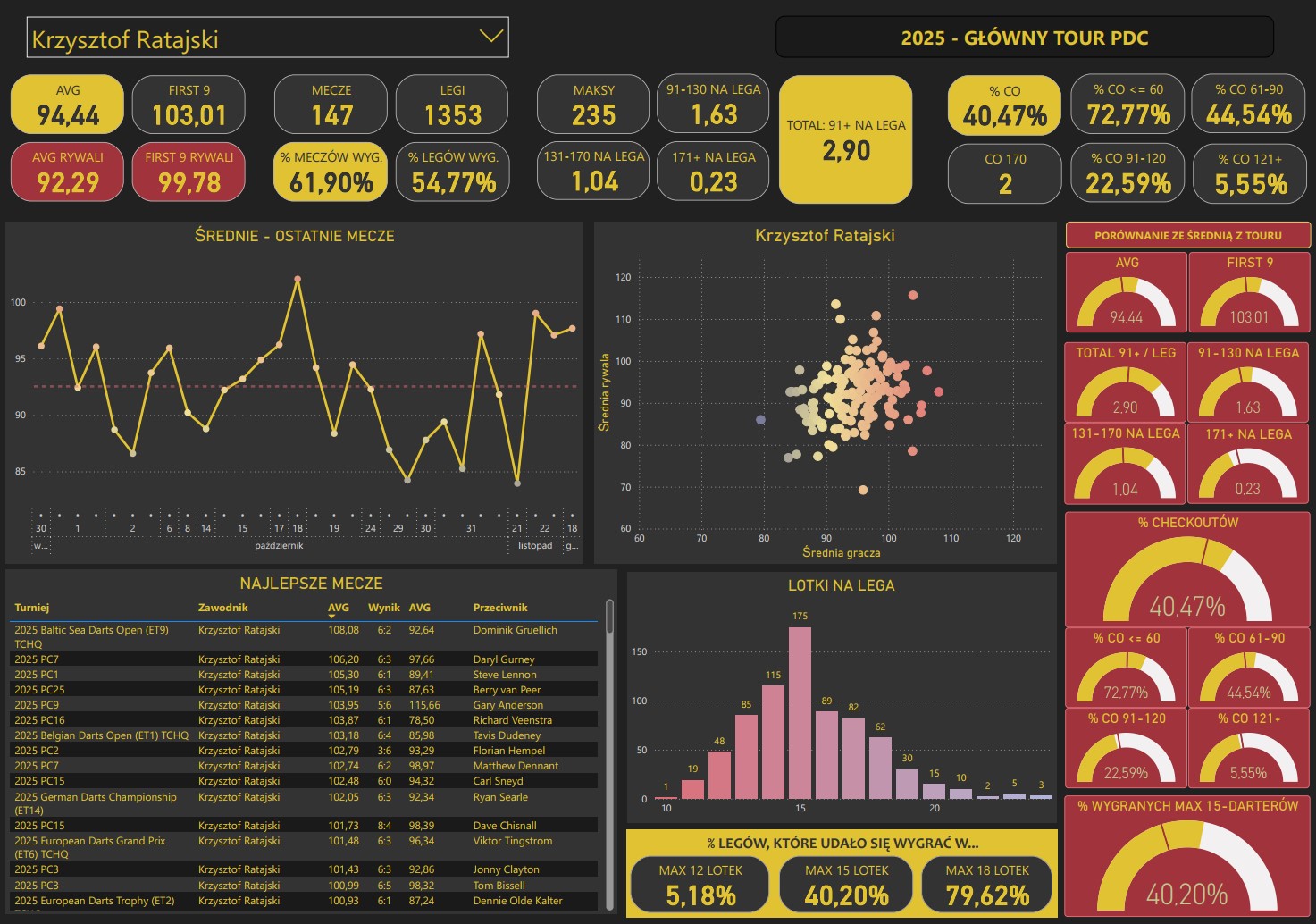 Całościowo: zarejestrowano u niego 41,4% trafionych lotek na podwójnych. Skuteczność Ratajskiego to 40,9%. Różnica jest minimalna – obaj znajdują się w szerokiej czołówce, ale sufit wyznacza Gian van Veen ze skutecznością 46%.