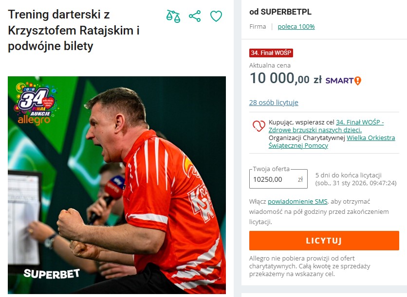 Spotkanie i trening z Krzysztofem Ratajskim oraz podwójne zaproszenie na Poland Darts Open – to pakiet dla zwycięzcy licytacji zorganizowanej przez Superbet na rzecz Wielkiej Orkiestry Świątecznej Pomocy. W aukcji można wziąć udział do końca stycznia, ale bez pokaźnego zaplecza finansowego się nie obejdzie – doszło już bowiem do pięciocyfrowej kwoty!