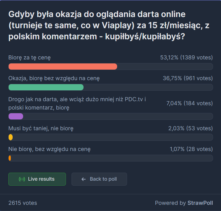 Dodatkowo ponad 36% biorących udział w głosowaniu zadeklarowało gotowość do kupna takiego produktu bez względu na jego cenę. Łącznie daje nam to prawie 90% użytkowników, którzy z chęcią znów zobaczyliby darta w polskiej telewizji. Kolejne siedem procent z Was stwierdziło, że co prawda 15 złotych to wygórowana cena za transmisje z pojedynczego sportu, ale ze względu na mniejsze koszty niż PDC.tv oraz polski komentarz byłaby chęć skorzystania z tej propozycji.