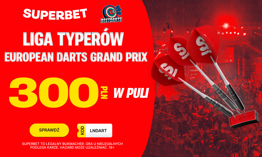 Freebety gwarantuje nasz sponsor generalny SUPERBET. Przy okazji przypominamy, że każda rejestracja przez dedykowany link TUTAJ z kodem LNDART i pierwsza wpłata min. 50 PLN wspiera funkcjonowanie naszego serwisu. Założenie konta to zaledwie 30 sekund, a możecie zyskać podwojenie pierwszej wpłaty do 200 zł, freebet 35 zł oraz dodatkowe 20 zł za postawienie zakładu w aplikacji. W Superbet obejrzycie również wszystkie spotkania European Darts Grand Prix.
