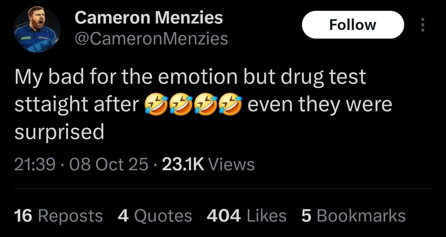 Tuż po spotkaniu z Crossem Menzies wrzucił na swój profil w serwisie X post, który po chwili usunął (co w jego przypadku zdarza się relatywnie często). Jak napisał, zaraz po spotkaniu przeprowadzono u niego test na doping.