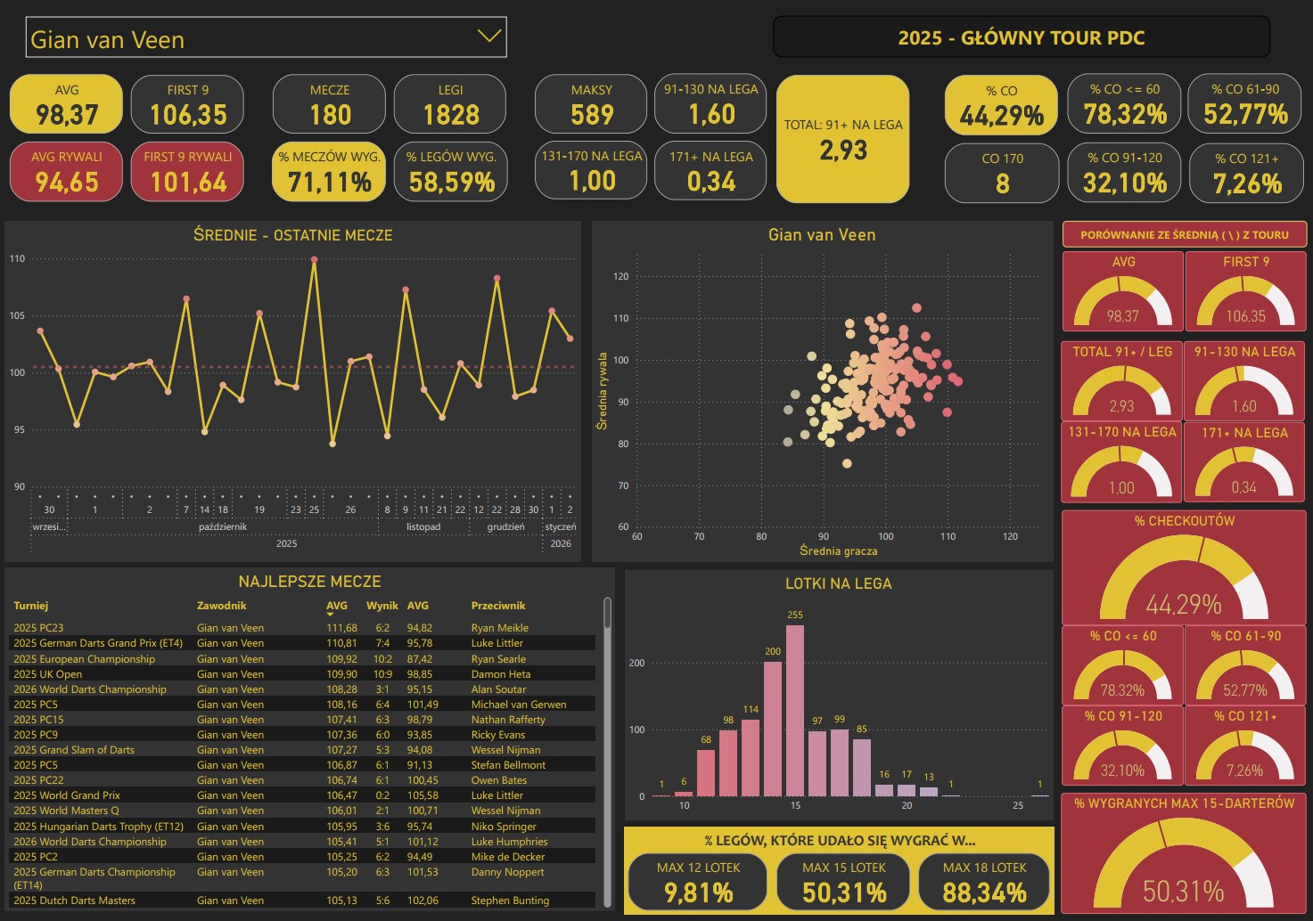 W tym sezonie tylko Littler (100,99) i Humphries (98,69) mogą poszczycić się wyższą ogólną średnią od van Veena (98,37). Inna sprawa, że w ostatnich miesiącach Holender gra lepiej – średnia od października wzwyż przekracza 100 punktów. Jest jednym z najlepiej punktujących i jednym z najlepiej kończących graczy na świecie.
